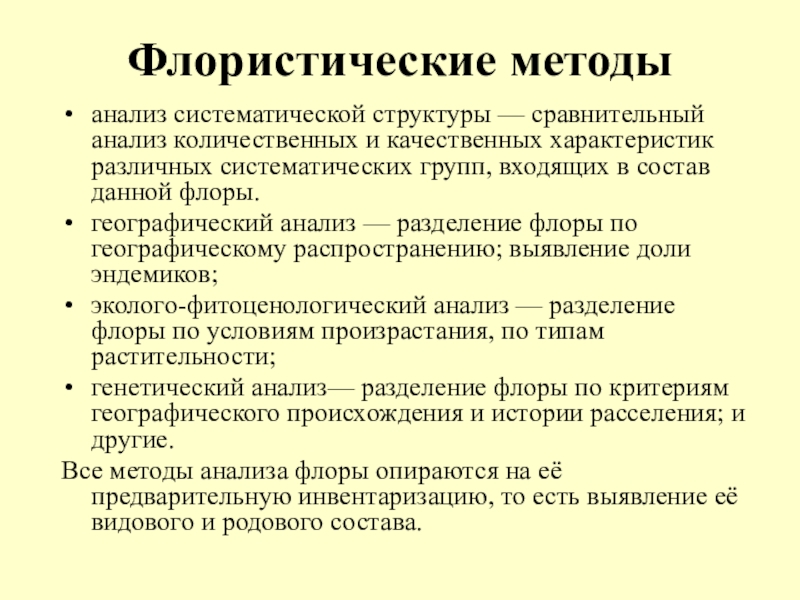 Все методы анализа флоры опираются на её предварительную инвентаризацию, то есть выявление её видового и родового состава.
