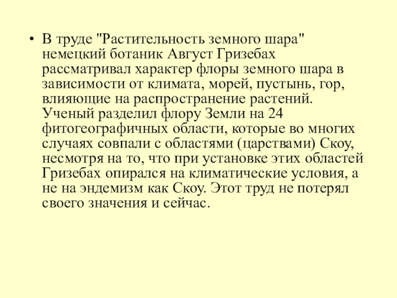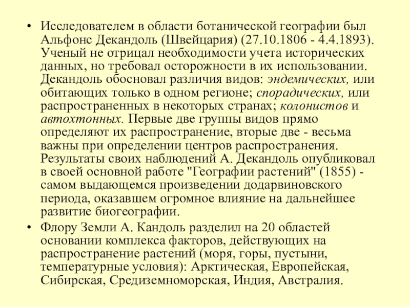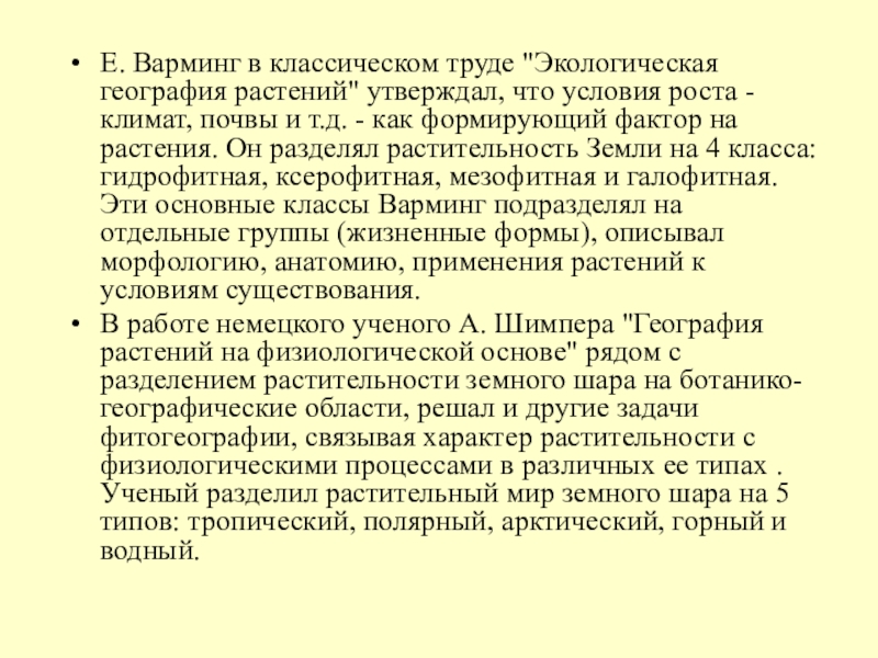 Он даже пытался выделить отдельные фитогеографические зоны и указать растения характерные для каждой из них. Так Теофраст отмечал своеобразие мангровой растительности, растительности гор, долин и т.д. Но фитогеографические идеи Теофраста не получили дальнейшего развития ни у ученых Древнего Рима, ни средневековье.