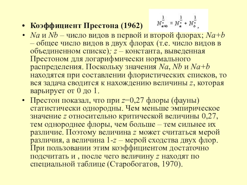 Престон показал, что при z=0,27 флоры (фауны) статистически однородны. Чем меньше эмпирическое значение z относительно критической величины 0,27, тем однороднее флоры, чем больше – тем сильнее их различие. Поэтому величина z может считаться мерой различия, а величина 1-z – мерой сходства двух флор. При пользовании этим коэффициентом достаточно подсчитать и , после чего величину z находят по специальной таблице (Старобогатов, 1970).