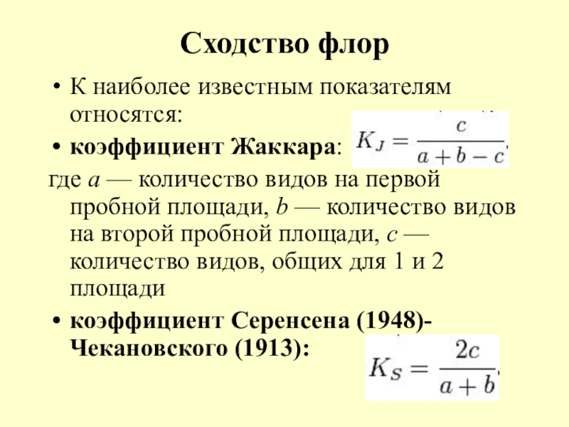 видов на первой пробной площади, b — количество видов на второй пробной площади, с — количество видов, общих для 1 и 2 площади