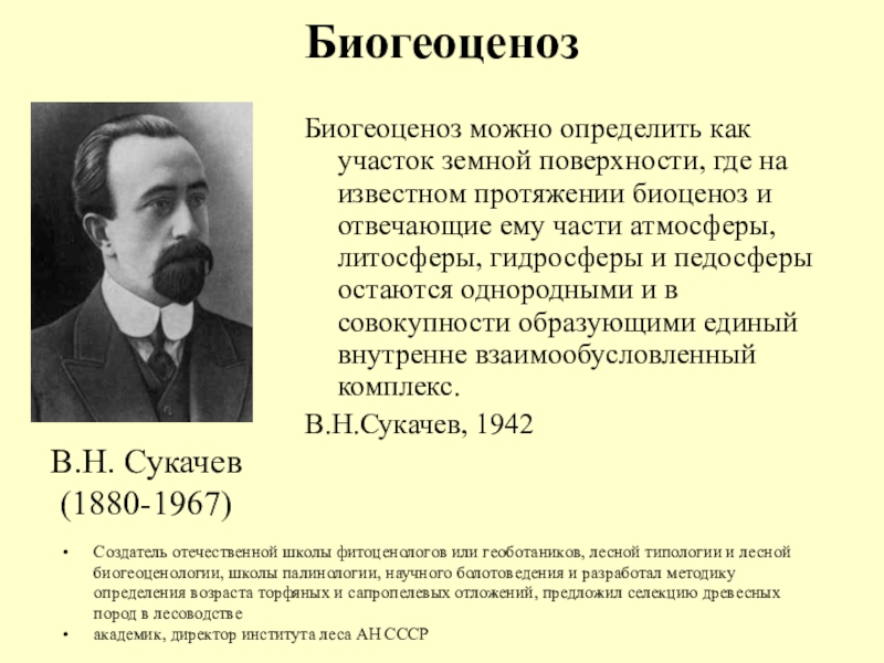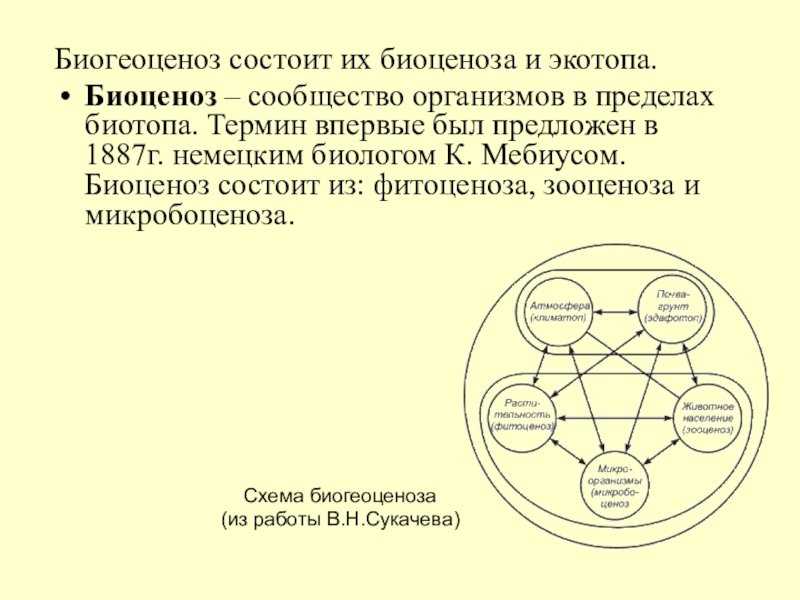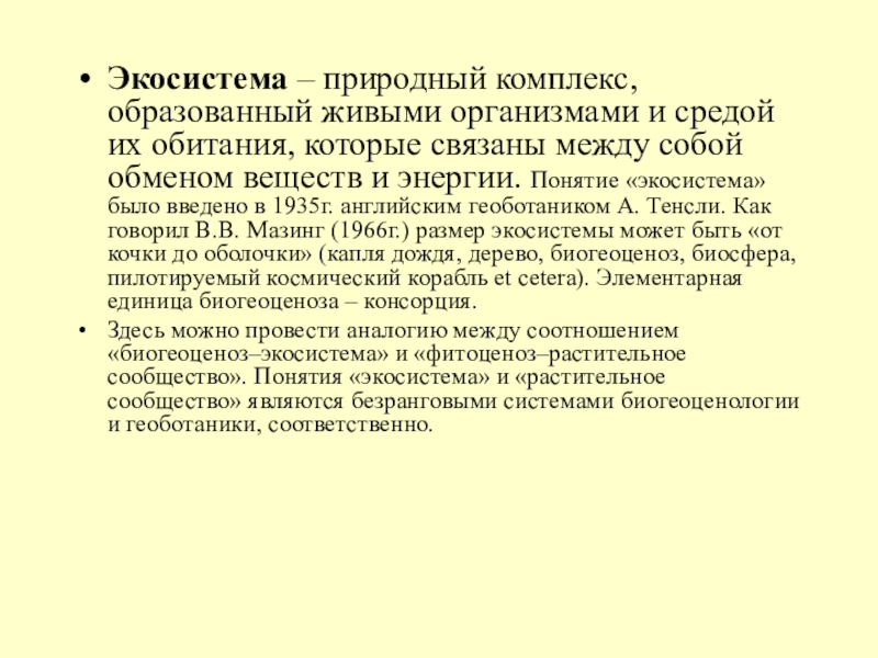 которые связаны между собой обменом веществ и энергии. Понятие «экосистема» было введено в 1935г. английским геоботаником А. Тенсли. Как говорил В.В. Мазинг (1966г.) размер экосистемы может быть «от кочки до оболочки» (капля дождя, дерево, биогеоценоз, биосфера, пилотируемый космический корабль et cetera). Элементарная единица биогеоценоза – консорция.