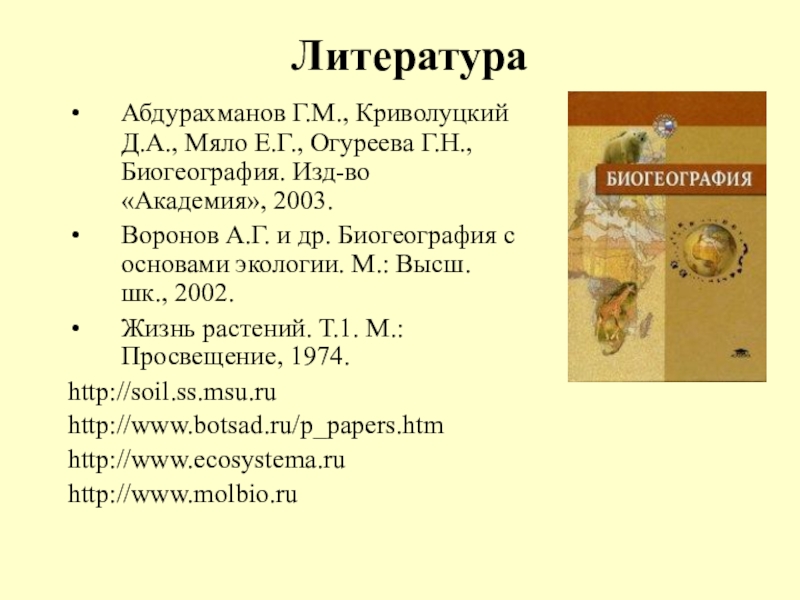 Биогеография : Учеб. для студ. вузов, обучающихся по географ. и эколог. спец. / Г. М. Абдурахманов [и др.]. - М. : AcademiA, 2003. - 474 с.