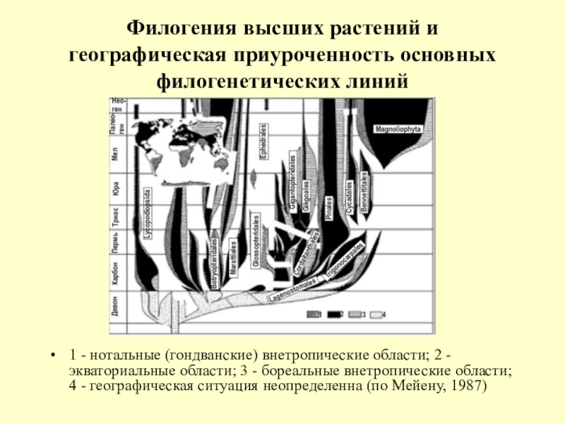 Слайд 73Филогения высших растений и географическая приуроченность основных филогенетических линий