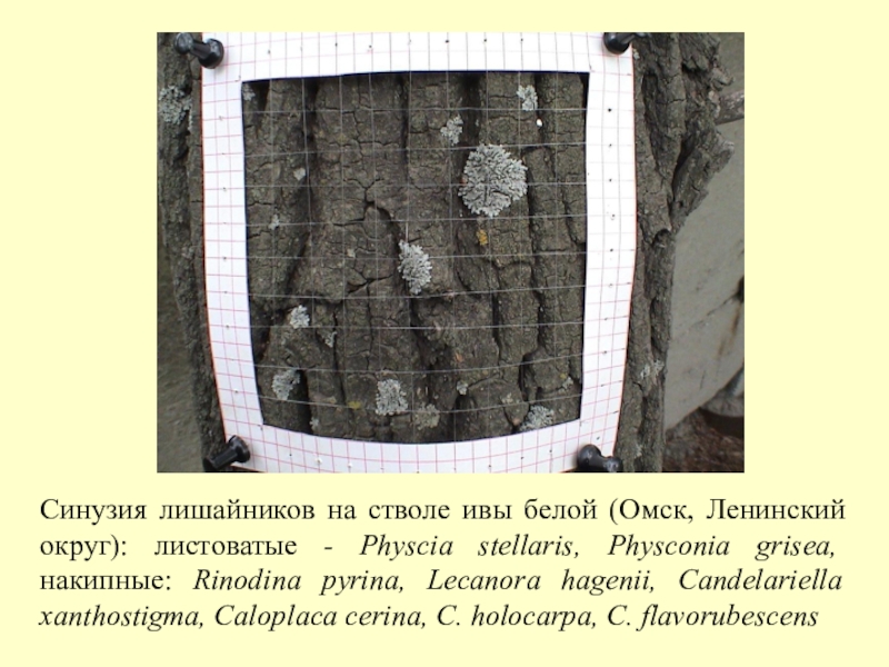 Слайд 63Синузия лишайников на стволе ивы белой (Омск, Ленинский округ): листоватые -