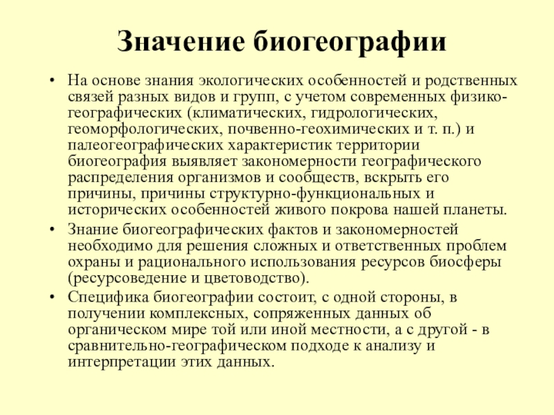 в концепции международной стратегии устойчивого развития и, в частности, в сохранении глобального биоразнообразия, теоретическая значимость биогеографии в связи с решением вопросов видообразования и эволюции определяют ее выдающееся положение в современном естествознании.