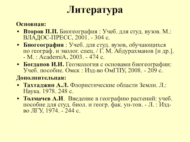 Второв П.П. Биогеография : Учеб. для студ. вузов. М.: ВЛАДОС-ПРЕСС, 2001.