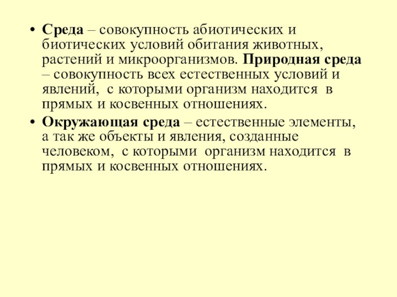 Окружающая среда – естественные элементы, а так же объекты и явления, созданные человеком, с которыми организм находится в прямых и косвенных отношениях.