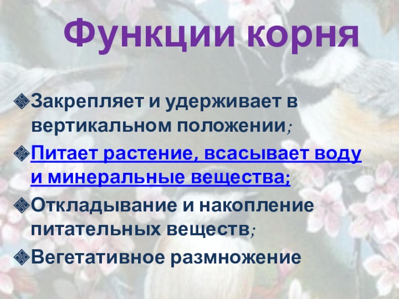 Функции корняЗакрепляет и удерживает в вертикальном положении;Питает растение, всасывает воду и минеральные вещества;Откладывание и накопление питательных веществ;Вегетативное