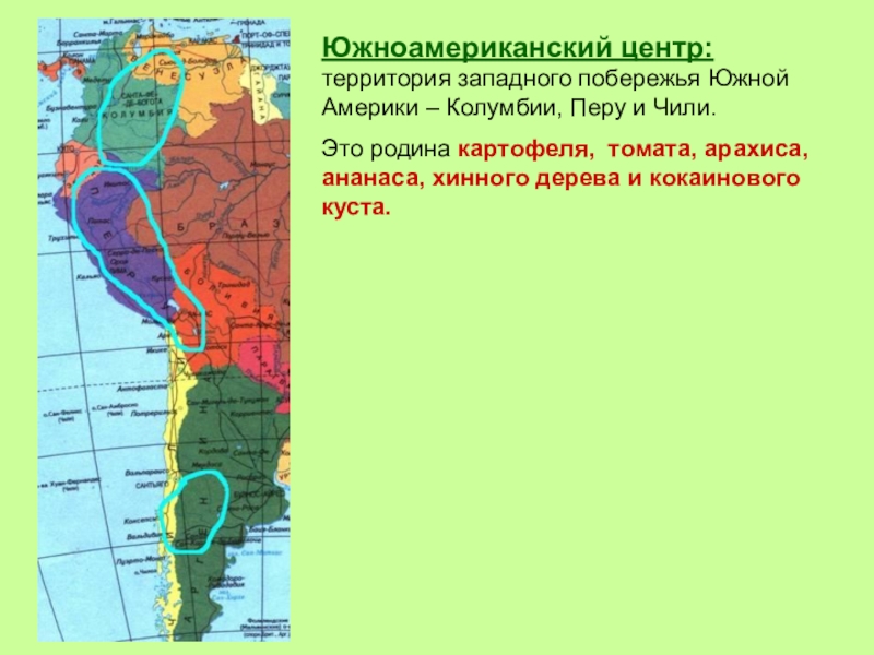 Слайд 16Южноамериканский центр: территория западного побережья Южной Америки – Колумбии, Перу и