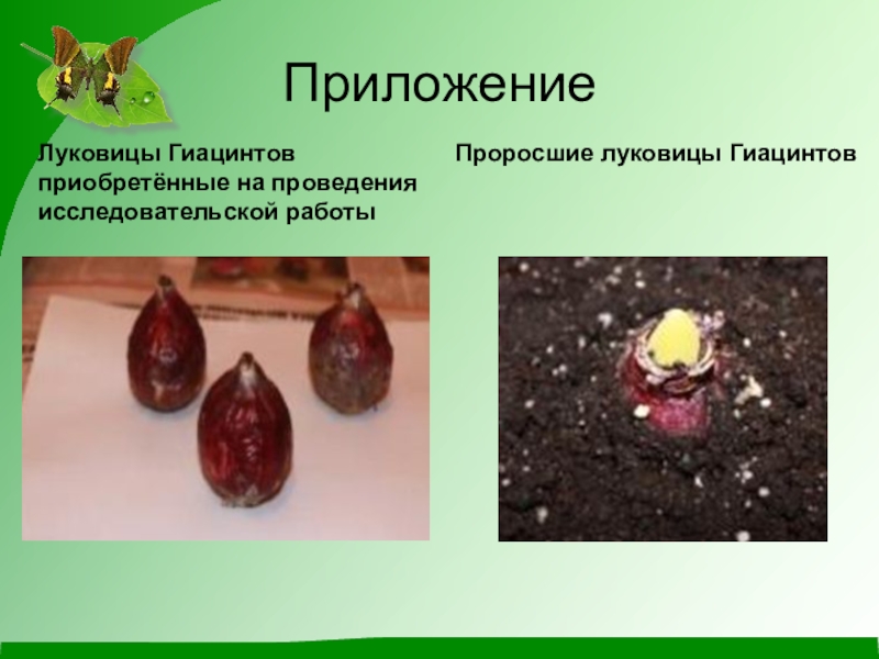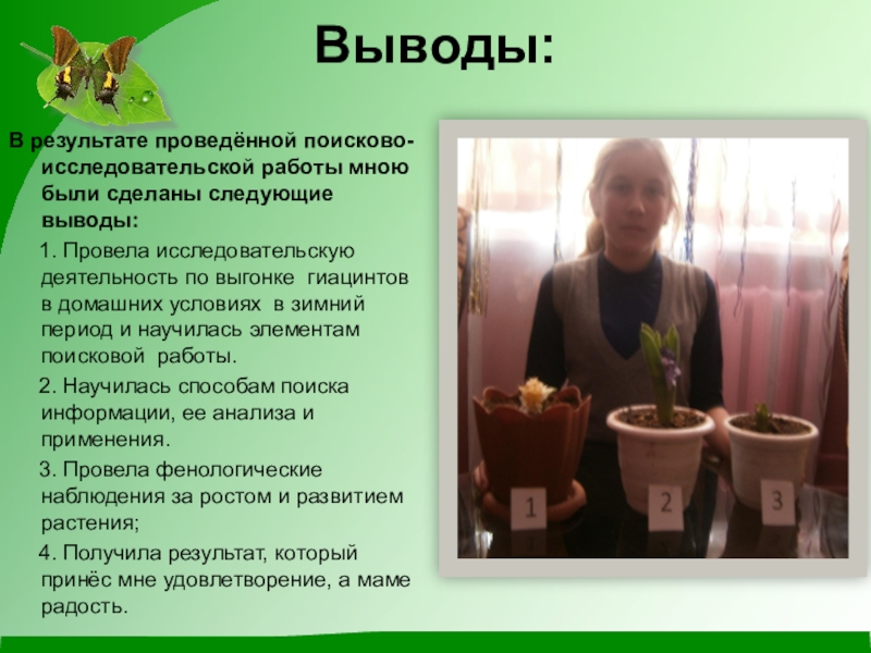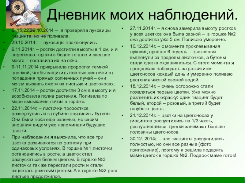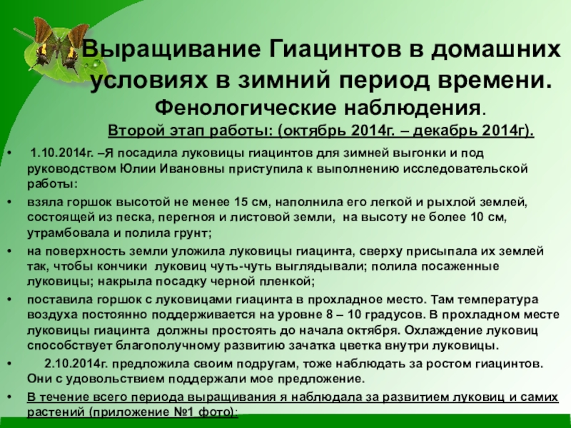 1.10.2014г. –Я посадила луковицы гиацинтов для зимней выгонки и под руководством Юлии Ивановны приступила к выполнению исследовательской работы: