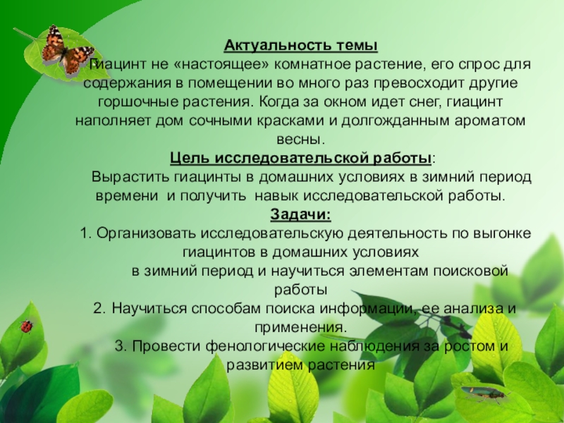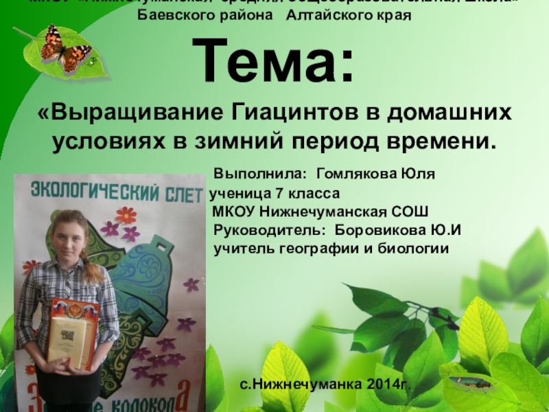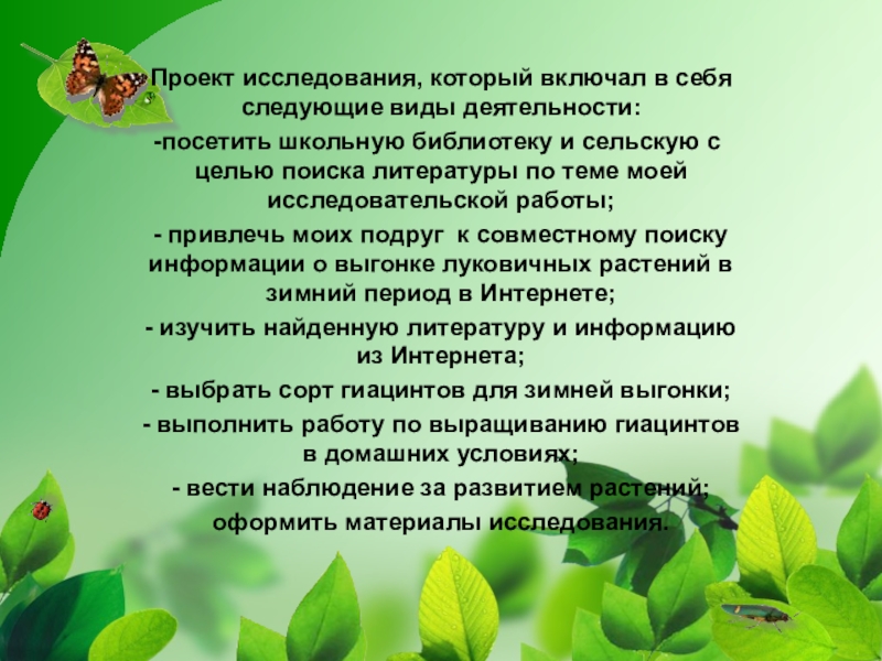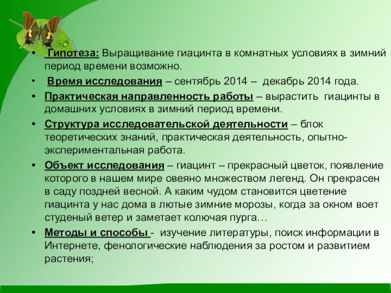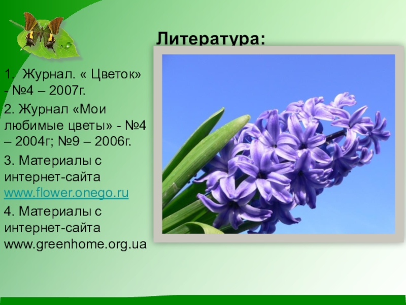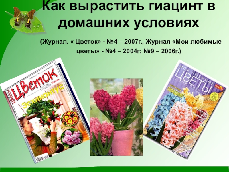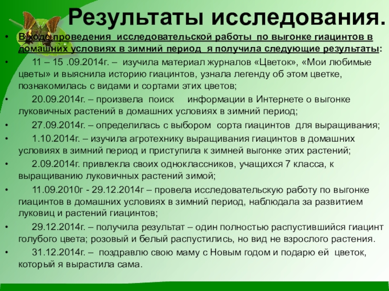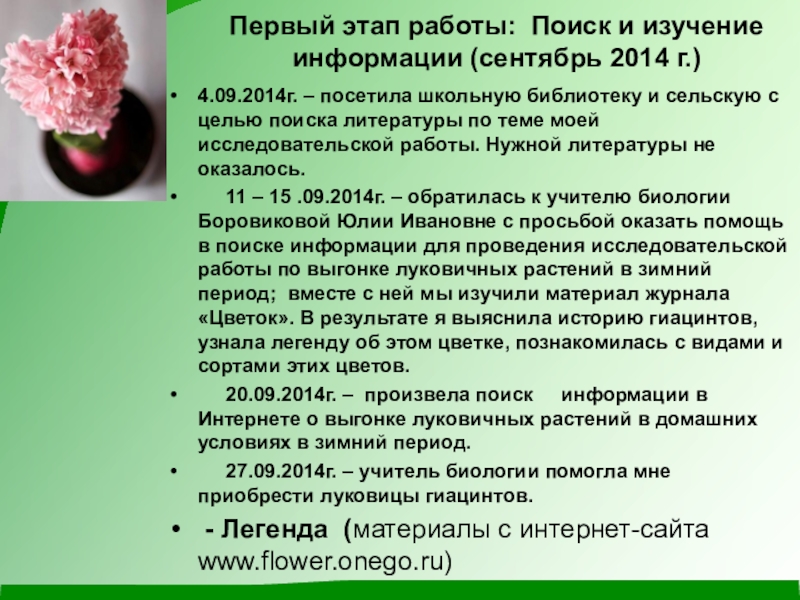 11 – 15 .09.2014г. – обратилась к учителю биологии Боровиковой Юлии Ивановне с просьбой оказать помощь в поиске информации для проведения исследовательской работы по выгонке луковичных растений в зимний период; вместе с ней мы изучили материал журнала «Цветок». В результате я выяснила историю гиацинтов, узнала легенду об этом цветке, познакомилась с видами и сортами этих цветов.