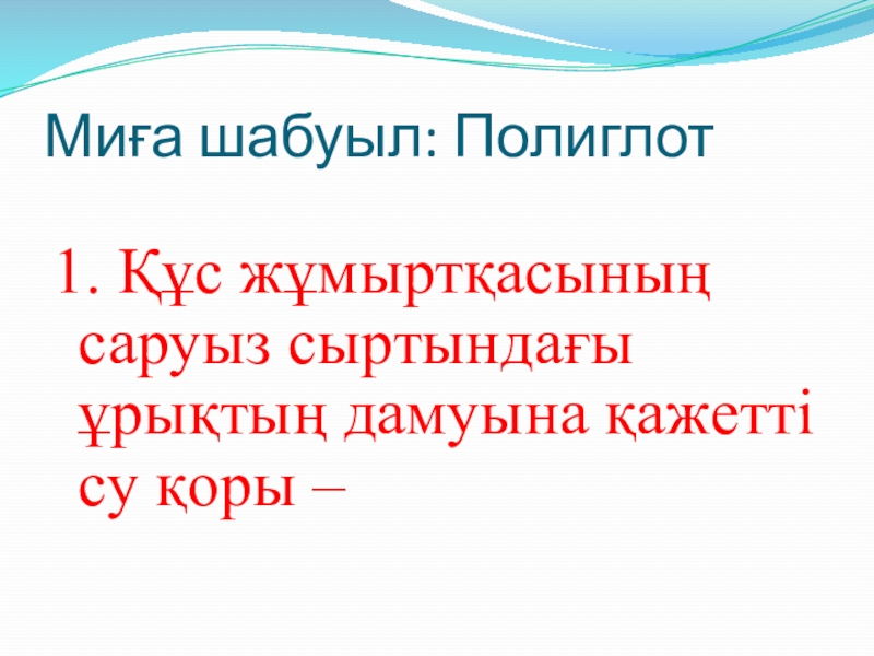 Миға шабуыл: Полиглот 1. Құс жұмыртқасының саруыз сыртындағы ұрықтың дамуына қажетті су қоры –