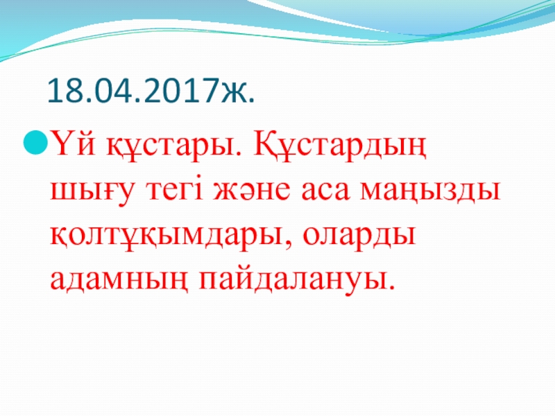 18.04.2017ж.Үй құстары. Құстардың шығу тегі және аса маңызды қолтұқымдары, оларды адамның пайдалануы.