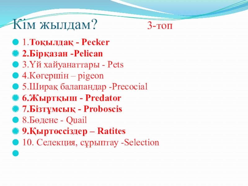 Кім жылдам?    3-топ1.Тоқылдақ - Pecker2.Бірқазан -Pelican3.Үй хайуанаттары - Pets4.Көгершін – pigeon5.Ширақ балапандар -Precocial6.Жыртқыш -