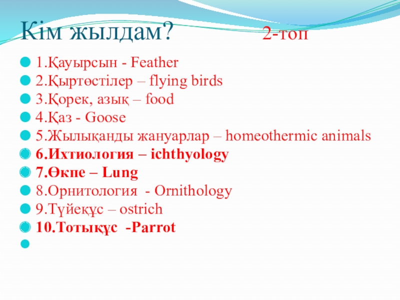 Кім жылдам?    2-топ1.Қауырсын - Feather2.Қыртөстілер – flying birds3.Қорек, азық – food4.Қаз - Goose5.Жылықанды жануарлар