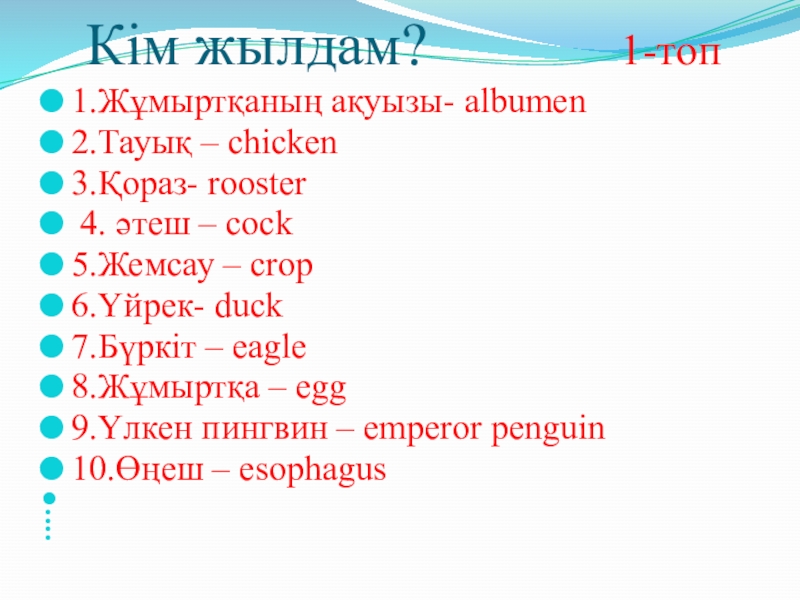 Кім жылдам?    1-топ1.Жұмыртқаның ақуызы- albumen2.Тауық – chicken3.Қораз- rooster 4. әтеш – cock5.Жемсау