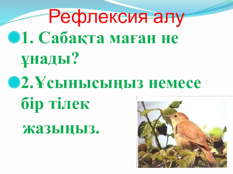 Рефлексия алу 1. Сабақта маған не ұнады?2.Ұсынысыңыз немесе бір тілек  жазыңыз.