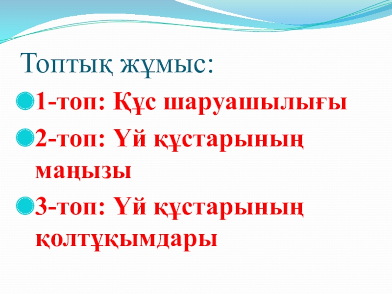Топтық жұмыс:1-топ: Құс шаруашылығы2-топ: Үй құстарының маңызы3-топ: Үй құстарының қолтұқымдары