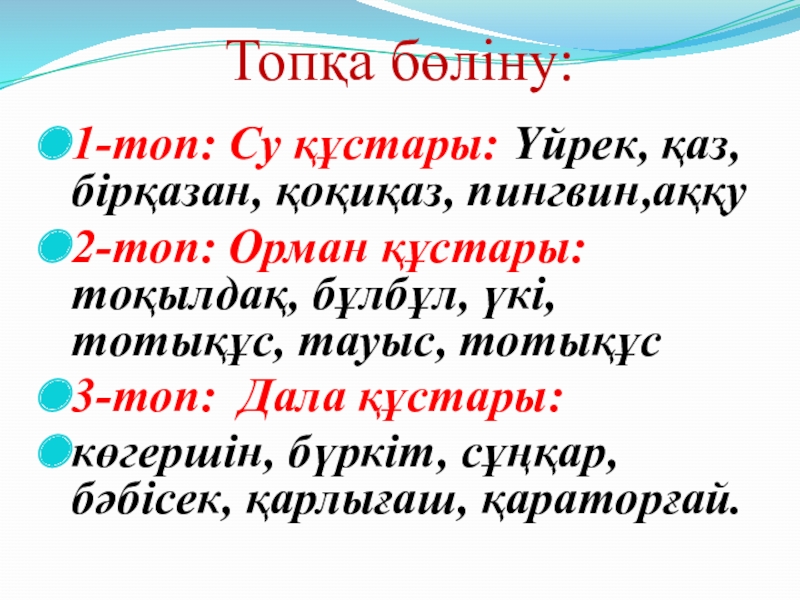 Топқа бөліну:1-топ: Су құстары: Үйрек, қаз, бірқазан, қоқиқаз, пингвин,аққу2-топ: Орман құстары: тоқылдақ, бұлбұл, үкі, тотықұс, тауыс, тотықұс3-топ:
