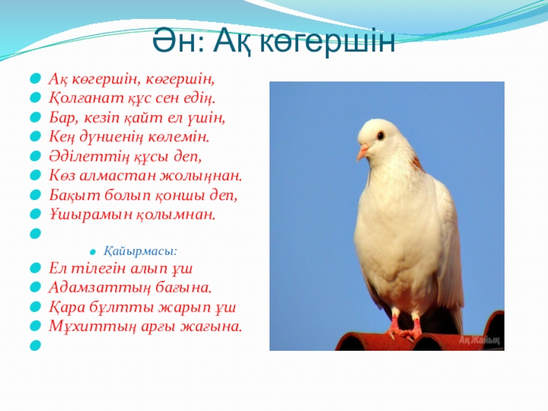 Ән: Ақ көгершінАқ көгершін, көгершін,Қолғанат құс сен едің.Бар, кезіп қайт ел үшін,Кең дүниенің көлемін.Әділеттің құсы деп,Көз алмастан