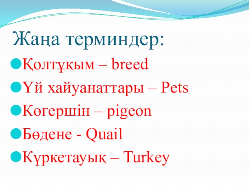 Жаңа терминдер:Қолтұқым – breedҮй хайуанаттары – PetsКөгершін – pigeonБөдене - QuailКүркетауық – Turkey