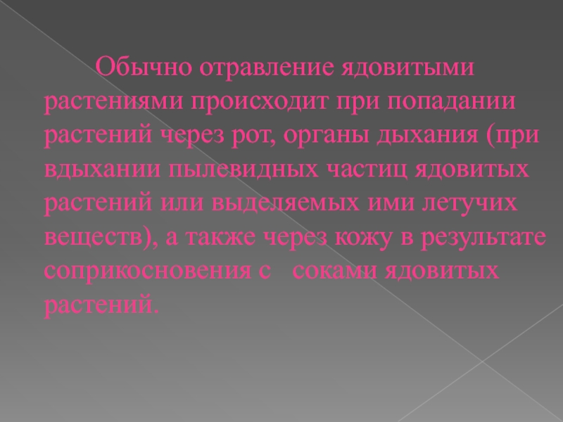 Обычно отравление ядовитыми растениями происходит при попадании растений через рот, органы дыхания (при вдыхании пылевидных частиц ядовитых растений или выделяемых ими летучих веществ), а также через кожу в результате соприкосновения с соками ядовитых растений.