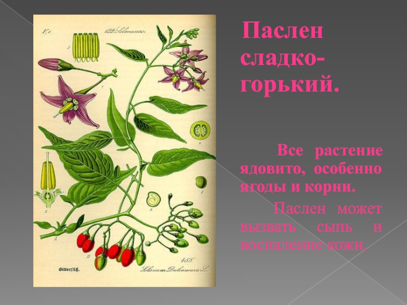 Паслен	сладко-горький.      Все растение ядовито, особенно ягоды и корни.