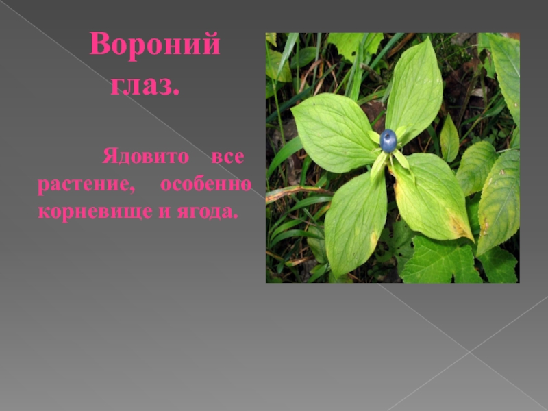 Вороний глаз.      Ядовито все растение, особенно корневище и