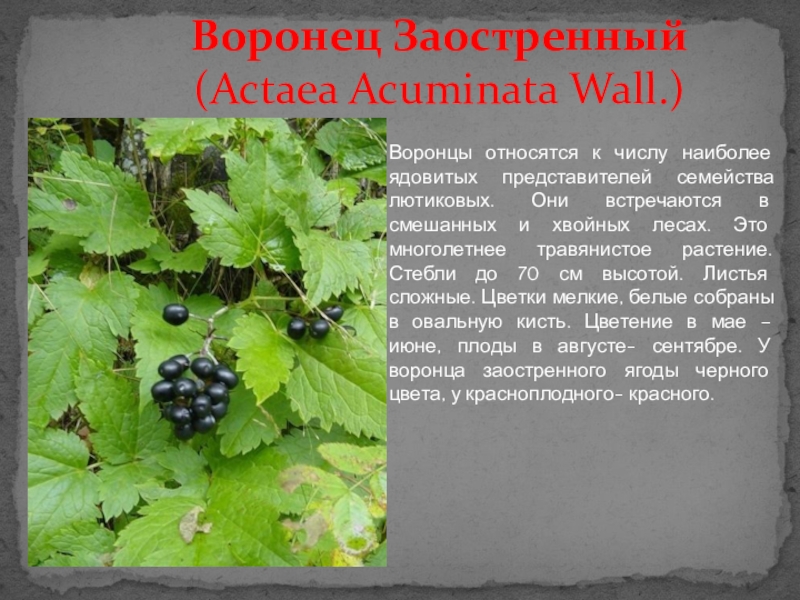 шаровидные костянки, собранные в короткую плотную кисть. Выглядят весьма привлекательно и их можно спутать с виноградом. В корневищах, листьях и плодах растения содержатся алкалоиды, сапонины и кумарины. Но наибольшую опасность представляют ягоды. Отравлен ими протекает довольно тяжело, с резкими нарушениями функции желудка и других внутренних органов.