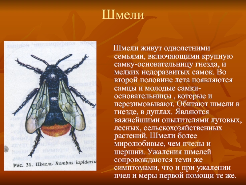 и мелких недоразвитых самок. Во второй половине лета появляются самцы и молодые самки- основательницы , которые и перезимовывают. Обитают шмели в гнезде, в дуплах. Являются важнейшими опылителями луговых, лесных, сельскохозяйственных растений. Шмели более миролюбивые, чем пчелы и шершни. Ужаления шмелей сопровождаются теми же симптомами, что и при ужалении пчел и меры первой помощи те же.