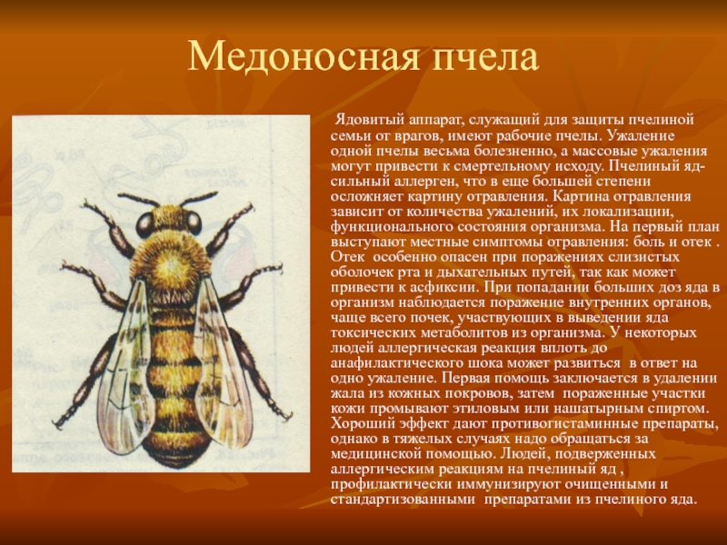 имеют рабочие пчелы. Ужаление одной пчелы весьма болезненно, а массовые ужаления могут привести к смертельному исходу. Пчелиный яд-сильный аллерген, что в еще большей степени осложняет картину отравления. Картина отравления зависит от количества ужалений, их локализации, функционального состояния организма. На первый план выступают местные симптомы отравления: боль и отек .Отек особенно опасен при поражениях слизистых оболочек рта и дыхательных путей, так как может привести к асфиксии. При попадании больших доз яда в организм наблюдается поражение внутренних органов, чаще всего почек, участвующих в выведении яда токсических метаболитов из организма. У некоторых людей аллергическая реакция вплоть до анафилактического шока может развиться в ответ на одно ужаление. Первая помощь заключается в удалении жала из кожных покровов, затем пораженные участки кожи промывают этиловым или нашатырным спиртом. Хороший эффект дают противогистаминные препараты, однако в тяжелых случаях надо обращаться за медицинской помощью. Людей, подверженных аллергическим реакциям на пчелиный яд , профилактически иммунизируют очищенными и стандартизованными препаратами из пчелиного яда.