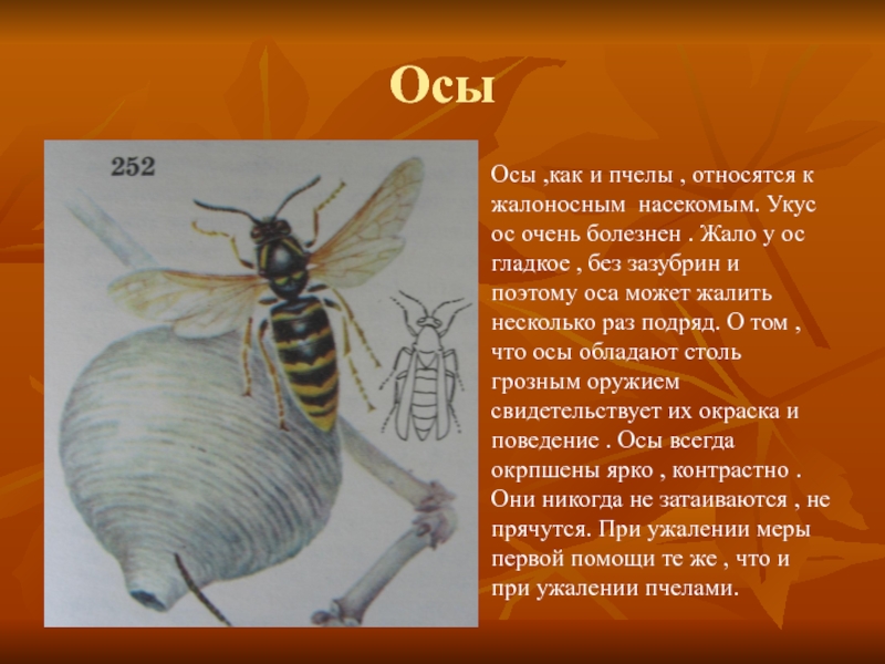 очень болезнен . Жало у ос гладкое , без зазубрин и поэтому оса может жалить несколько раз подряд. О том , что осы обладают столь грозным оружием свидетельствует их окраска и поведение . Осы всегда окрпшены ярко , контрастно . Они никогда не затаиваются , не прячутся. При ужалении меры первой помощи те же , что и при ужалении пчелами.
