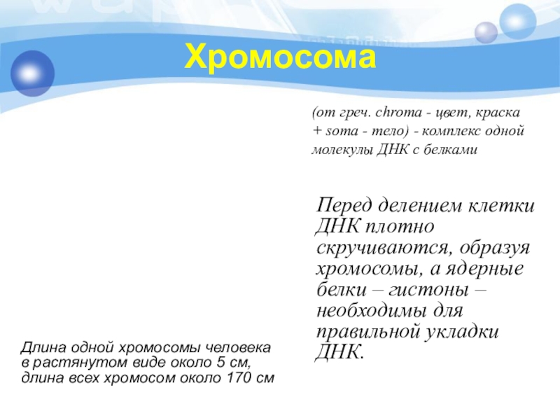 Длина одной хромосомы человека в растянутом виде около 5 см, длина всех хромосом около 170 см