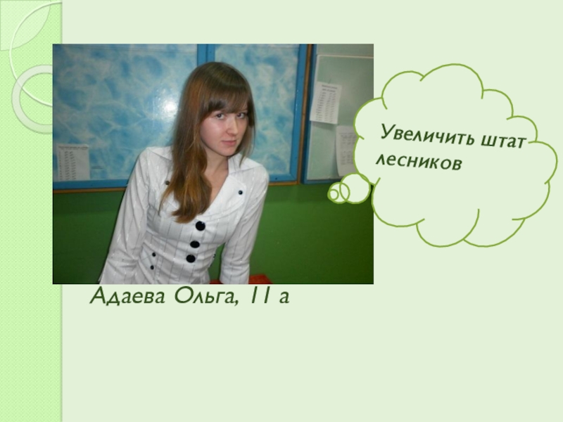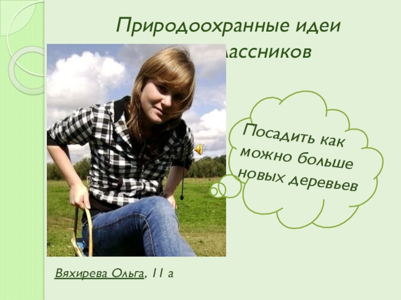 Природоохранные идеи старшеклассниковВяхирева Ольга, 11 аПосадить как можно больше новых деревьев