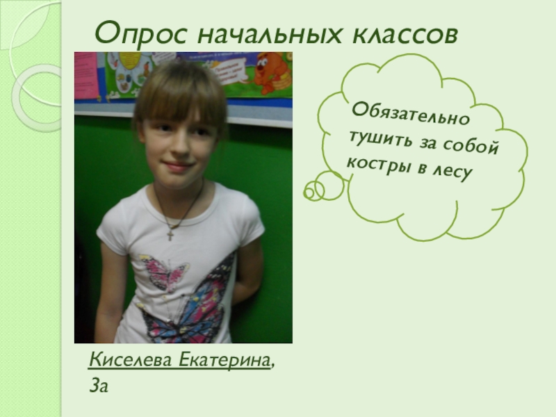 Опрос начальных классовКиселева Екатерина, 3аОбязательно тушить за собой костры в лесу