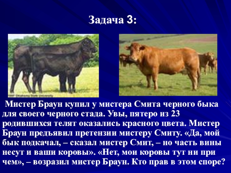 своего черного стада. Увы, пятеро из 23 родившихся телят оказались красного цвета. Мистер Браун предъявил претензии мистеру Смиту. «Да, мой бык подкачал, – сказал мистер Смит, – но часть вины несут и ваши коровы». «Нет, мои коровы тут ни при чем», – возразил мистер Браун. Кто прав в этом споре?