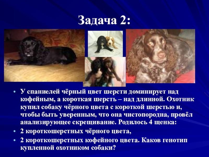 Задача 2:У спаниелей чёрный цвет шерсти доминирует над кофейным, а короткая шерсть – над длинной. Охотник купил