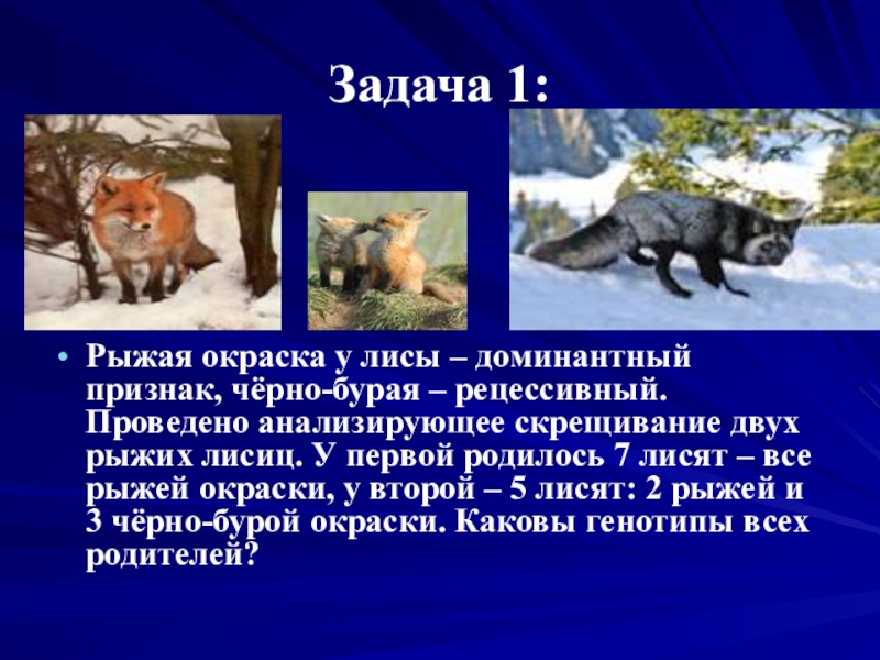 Задача 1:Рыжая окраска у лисы – доминантный признак, чёрно-бурая – рецессивный. Проведено анализирующее скрещивание двух рыжих лисиц.