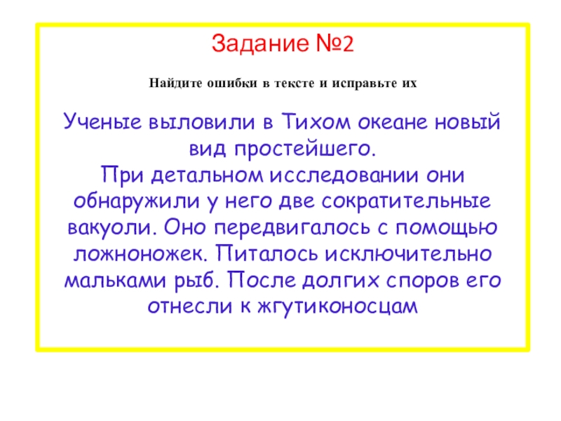 Задание №2 Найдите ошибки в тексте и исправьте ихУченые выловили в Тихом океане новый вид простейшего.При детальном