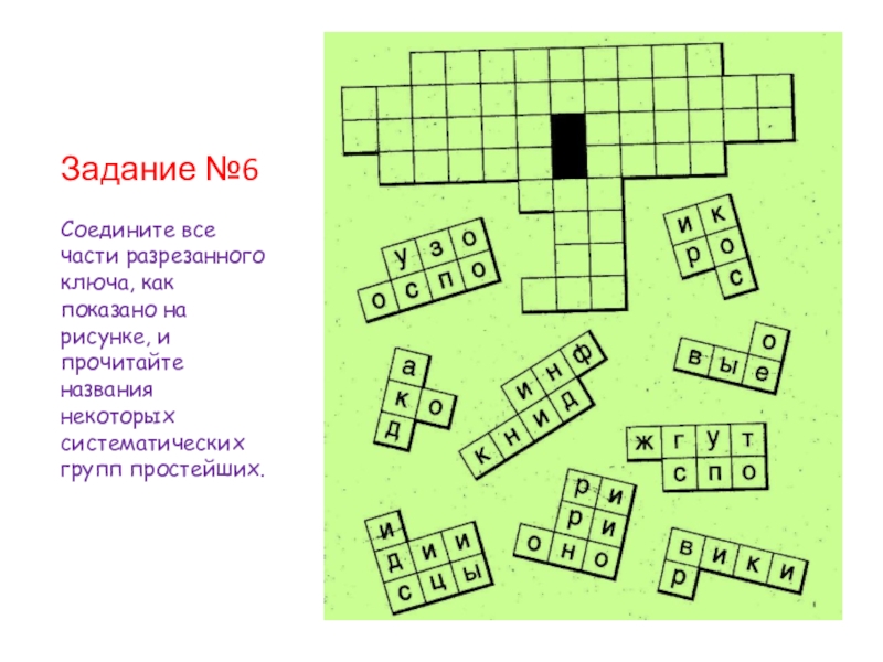 Задание №6Соедините все части разрезанного ключа, как показано на рисунке, и прочитайте названия некоторых систематических групп простейших.