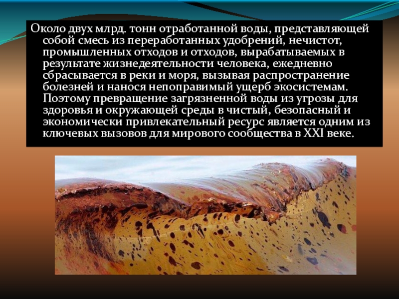 Слайд 8Около двух млрд. тонн отработанной воды, представляющей собой смесь из переработанных