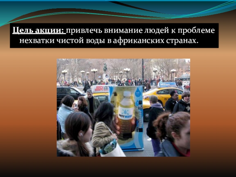 Слайд 21Цель акции: привлечь внимание людей к проблеме нехватки чистой воды в