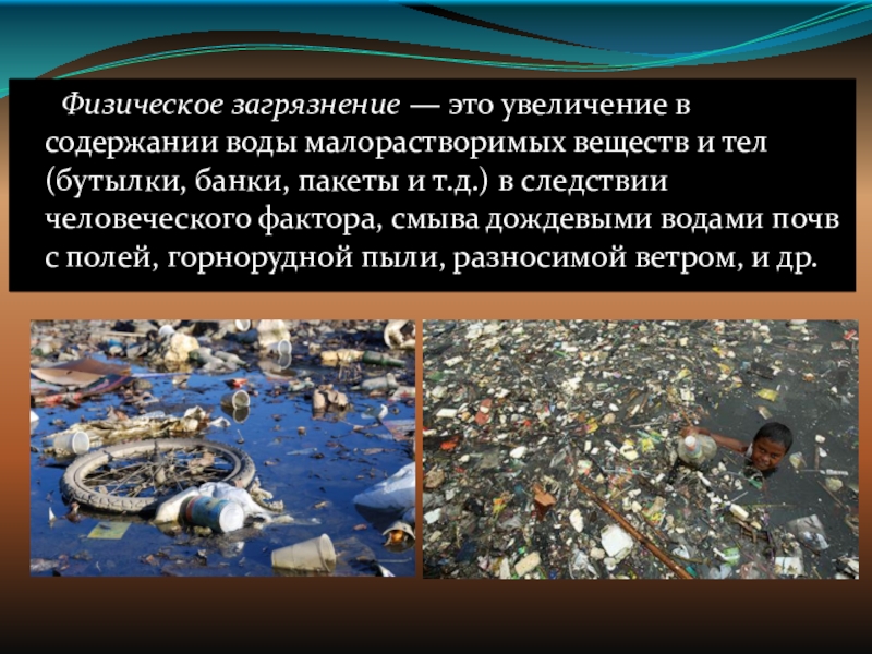 Слайд 15 Физическое загрязнение — это увеличение в содержании воды малорастворимых веществ и тел
