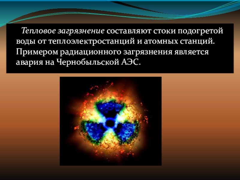 Слайд 14 Тепловое загрязнение составляют стоки подогретой воды от теплоэлектростанций и атомных станций. Примером