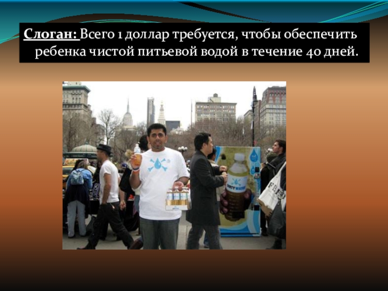Слайд 23Слоган: Всего 1 доллар требуется, чтобы обеспечить ребенка чистой питьевой водой