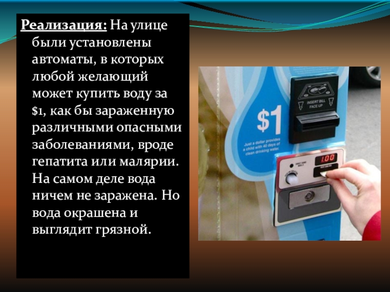Слайд 22Реализация: На улице были установлены автоматы, в которых любой желающий может купить