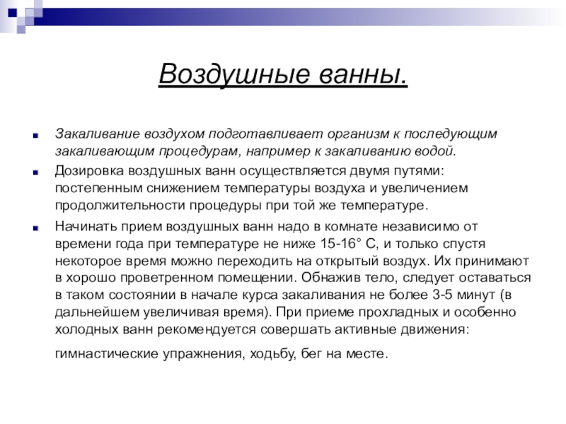 Начинать прием воздушных ванн надо в комнате независимо от времени года при температуре не ниже 15-16° С, и только спустя некоторое время можно переходить на открытый воздух. Их принимают в хорошо проветренном помещении. Обнажив тело, следует оставаться в таком состоянии в начале курса закаливания не более 3-5 минут (в дальнейшем увеличивая время). При приеме прохладных и особенно холодных ванн рекомендуется совершать активные движения: гимнастические упражнения, ходьбу, бег на месте.