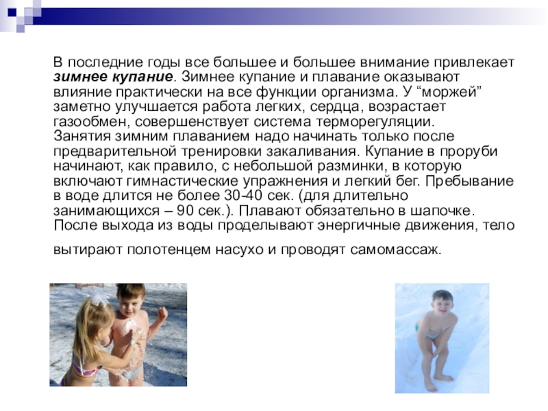 и большее внимание привлекает зимнее купание. Зимнее купание и плавание оказывают влияние практически на все функции организма. У “моржей” заметно улучшается работа легких, сердца, возрастает газообмен, совершенствует система терморегуляции. Занятия зимним плаванием надо начинать только после предварительной тренировки закаливания. Купание в проруби начинают, как правило, с небольшой разминки, в которую включают гимнастические упражнения и легкий бег. Пребывание в воде длится не более 30-40 сек. (для длительно занимающихся – 90 сек.). Плавают обязательно в шапочке. После выхода из воды проделывают энергичные движения, тело вытирают полотенцем насухо и проводят самомассаж.