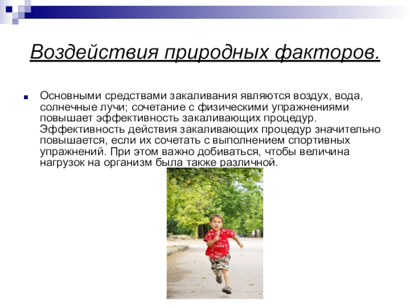 Основными средствами закаливания являются воздух, вода, солнечные лучи; сочетание