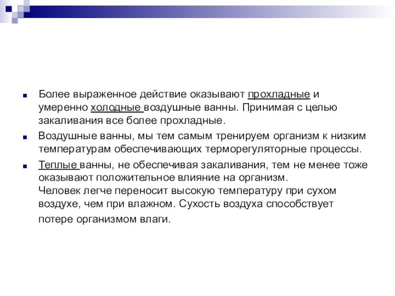 Более выраженное действие оказывают прохладные и умеренно холодные воздушные ванны. Принимая